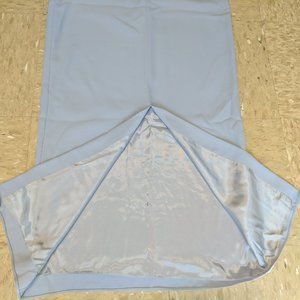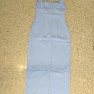 Up for sale is a Light Blue size 8 gown/dress. This dress is fully lined in acetate with empire style, a back zipper, and jewel trim at the bodice. There is a little place where the dress was repaired at the seam on the slit as seen in the pictures, but nothing too major. The brand is Watters and Watters.