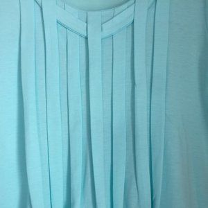 This color is so refreshing. It has box pleats on the bust that add a nice element to the style. There aren't tags for size or fabric content. I'm fairly sure this came from China as it took weeks to get here and then it didn't fit. The nerve, they wanted $35 to mail it back, nope! I can tell you, though, that this a soft knit that feels so good and it will fit a slim M. I highly recommend hand wash/hang to dry to keep the shape of the top and to avoid shrinkage.