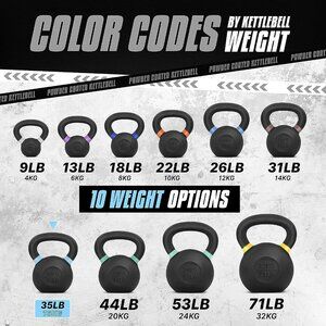 SOLID CAST IRON: Challenge yourself with 35 Lbs strength training kettlebells, actual weight can range from 33.95LB to 36.05LB; The powder coating prevents corrosion and provides a better grip, eliminating the slipping common with glossy finishes