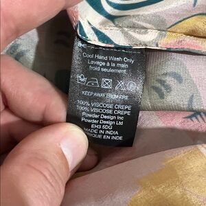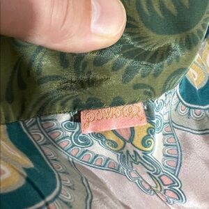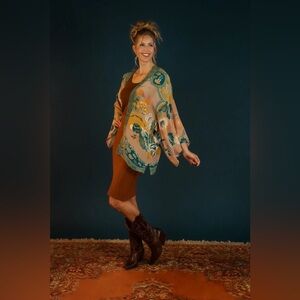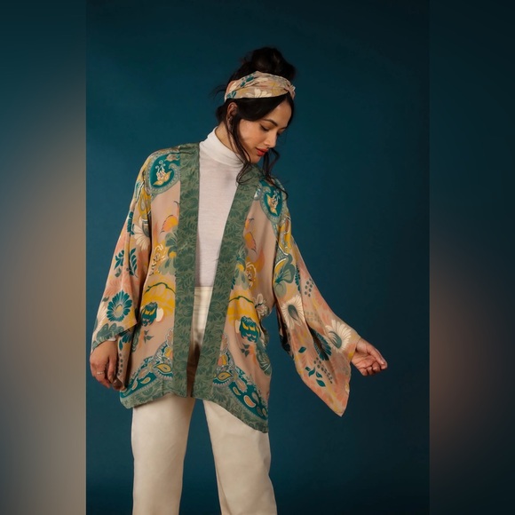 This is a super unique, Boho themed, Anthropologie brand Powder Folk Art Floral Kimono Jacket. In a muted pink, green and multi colored, all over paisley floral print, this is an open front cardigan style jacket made of a satin like fabric blend. It has the unique oversized sleeves and accents down the front seams.