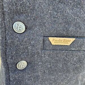 Powder River Outfitters Panhandle Slim men’s vest, size XXL. Made with a warm and durable wool blend (80% wool, 20% nylon) with a smooth 100% polyester lining for comfort. Classic black heathered color with a western-inspired design. Features a button front closure with embossed PR buttons, notched lapel collar, and four front pockets for style and function. Back features slight gathered detailing for fit. Designed in Texas, made in China.