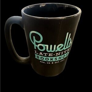 Stylish black mug with Powell's Late-Nite Bookshop logo. Perfect for coffee lovers.