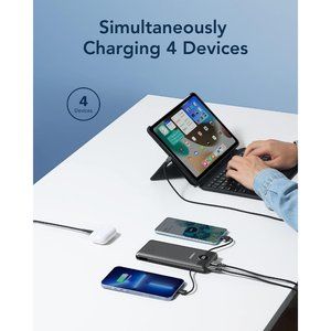 This Portable phone charger is designed with 4 outputs: 2 Cables outputs charging and additional USB C and USB A outputs. It supports 4 devices charging max simultaneously. The bidirectional Type-C ports works as input and output. Each of the cables and USB ports output supports 15W max fast charging.