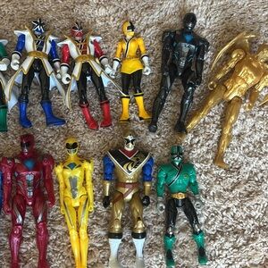 Exciting Power Ranger action figure set. Includes red, pink, blue, yellow, green, black, and gold figures. 15 characters and one motorcycle.