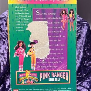 Pink Ranger Kimberly in her classic pink suit. Includes helmet and accessories. Also includes dress and pink shoes. Hard to see in photos but the gun and shoes are in the box.