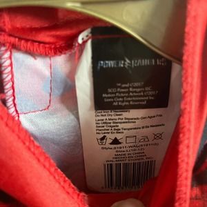 Red and silver Power Ranger costume for kids. Features detailed design. Perfect for Halloween. ONLY THE JUMPSUIT