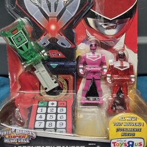 Bandai Power Rangers Super Megaforce Legendary Ranger Green Key Pink/Red Figures. New in packaging. Some edges of the clear plastic are loose from the cardboard because the glue has dried up but they are still factory taped on the back. Cardboard shows some creasing and wear. See photos.