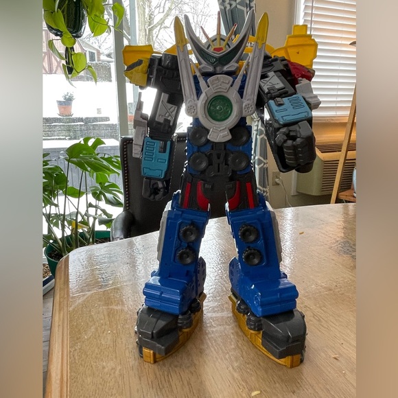 Megazord battery-powered action figure. About 10”. Says exciting things when you push the green button, like “it’s time to defend the grid!” (Also has an OFF switch!) I think he originally came with some sort of weapon but…that’s long gone. We’ve grown out of the Power Rangers phase so looking to pass this on to the next kid. Normal play wear and tear - obviously missing sword thingy.