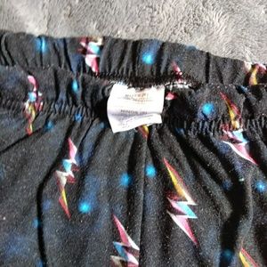 Shirt sleeve shirt with Power Ranger images, and a solid red back. Black elastic waist shorts with the multi colored lightning bolt of Power Rangers.