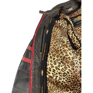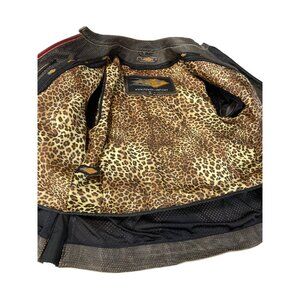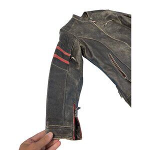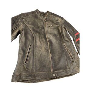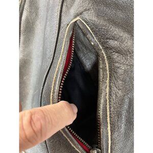 This Power Trip women's leather motorcycle jacket is crafted for durability and style. Featuring a classic brown leather design, it offers protection and comfort for riders. The jacket's is sleek and ready for your next adventure. Length 25.5", shoulders 17.5", pits 20", waist 20", hem 23", Sleeve length 22". No defects noted except normal wear and scratches. SKU 9247