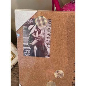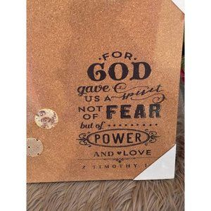 This wall art is made of cork board and features a verse from 2 Timothy 1:7. It says "For God gave us a spirit not of fear but of power and love." and comes with 3 decorative push pins. It measures 15" x 15".