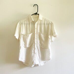 Women's short sleeve, loose fitting shirt with large chest pockets.