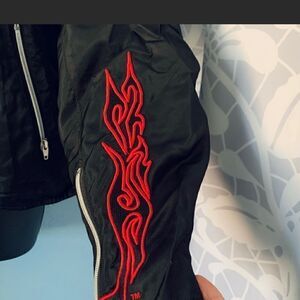 Front. Zipper vents on back & back of sleeves. Zip cuffs. Zip front pockets. Removable fleece liner. Inside zip pocket. Adjustable buckles at waist. All hardware is silver tone. Red & gray Orange County Choppers embroidered logo on back. Red embroidered flames on each sleeve. Elbows & shoulders have built in protective armor. Sleeves are designed to curve forward. Jacket is in excellent condition. Worn once. Nylon/polyester fabric. Power Trip Size XL
