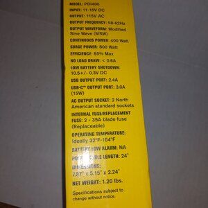 The PowerDrive 400W Power Inverter is a versatile and reliable device that allows you to power a variety of electronics while on the go. With an input voltage of 12V and output voltage of 110V, this inverter is capable of providing power to a range of devices. Featuring dual USB ports for added convenience, this model is perfect for charging your devices quickly and efficiently. The RMS power of 400W ensures that you have plenty of power to run multiple devices simultaneously. Ideal for use in vehicles, this Power Inverter from PowerDrive is a must-have accessory for any road trip or outdoor adventure.