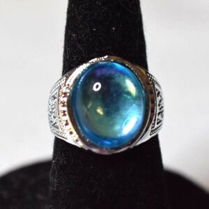 Powerful Sky Blue Oval Stone Art Deco Etched Silver Tone Metal Sizes 5 & 6 Rings