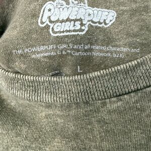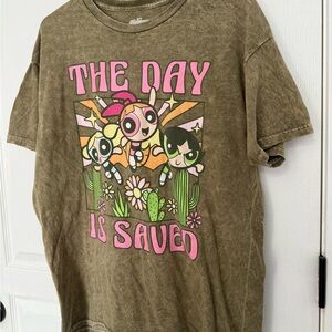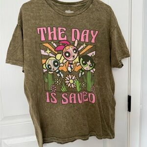 This stylish olive green t-shirt features a vibrant Powerpuff Girls graphic. Perfect for fans, it combines comfort with fun design.