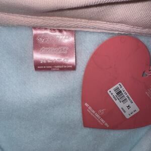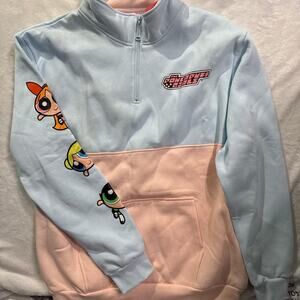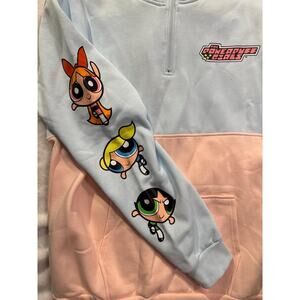 Official Powerpuff Girls pastel quarter-zip sweatshirt by Cakeworthy. Features Blossom, Bubbles, and Buttercup down the sleeve with the logo on the chest. Pastel blue and pink colorblock design with kangaroo pocket and ribbed cuffs/hem. Unisex XL fit, cozy and perfect for fans of the classic Cartoon Network show. Retails for $47.95 – this one is brand new with tags!