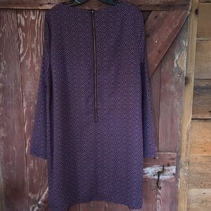PrAna Black/Plum print crew neck long sleeve crewneck lined body crepe midi shift. Exposed back zipper. 100% polyester. XL. Armpit to armpit approximately 21 1/2 inches. Shoulder to hem approximately eight 38 inches. NWT. Nonsmoking home.