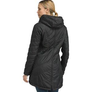 PrAna Diva Long Hooded Jacket Size Small Snap Full Zip Black Outerwear Winter