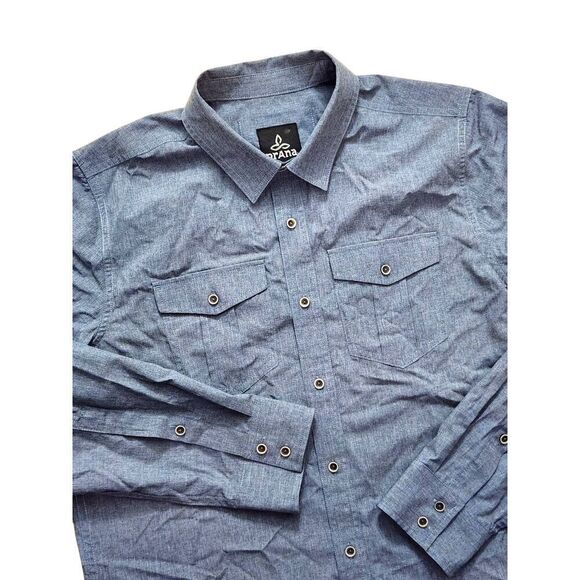 PrAna Men's Med button up Hiking Outdoor shirt Blue chest pocket Roll Tab nylon