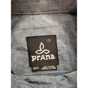 PrAna Men's Medium button up Hiking Outdoor shirt Blue double chest pocket nylon blend. Good pre-owned condition no stains no holes measurements provided in pictures are approximate please check measurements for proper fit