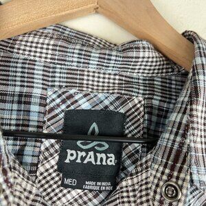 PrAna Mens Plaid Holstad Long Sleeve Snap Button Western Shirt. Brown blue plaid with western embroidered detail. Lightweight. Regular fit. Faux wood snap button front closure. Organic cotton polyester blend. Size Medium. Armpit to armpit: 21.5". Armpit to end of sleeve: 19.5". Length: 27.5". (481)
