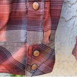 PrAna Brown Plaid Casual Snap Button up Shirt. Two front snap pockets.
