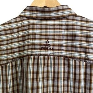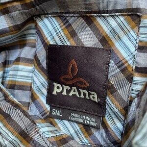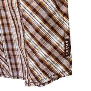 PrAna Mens Top Organic Cotton Brown Plaid Short Sleeve Snap Shirt Size Small
