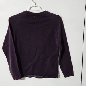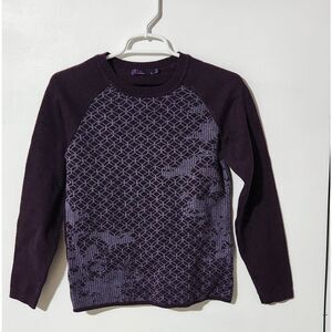 Stylish purple sweater with a unique pattern. Long sleeves and crew neck. Perfect for casual wear.
