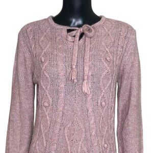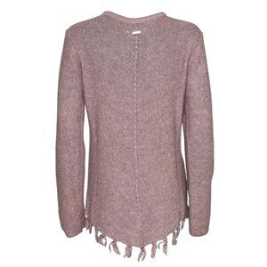 Beautiful PrAna Shelby Poncho Cable Knit Fringe Sweater in a soft mauve pink hue — a perfect blend of boho charm and cozy comfort. This sweater features an intricate cable knit pattern, fringe tassel hem, and a tassel-tie neckline that can be worn loose or tied for different looks. The flattering medium weight and relaxed fit make it ideal for cool weather layering.
