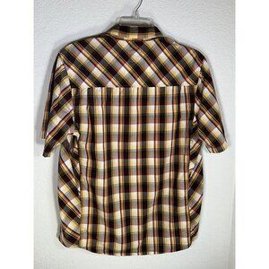 PrAna Shirt Mens Small Pearl Snap Plaid Short Sleeve Brown Yellow Maroon Casual