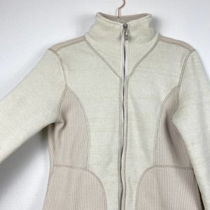 PrAna Tobi Full Zip Sweater Two Tone Cream Beige Pockets Ribbed Knit Women L
