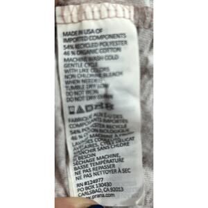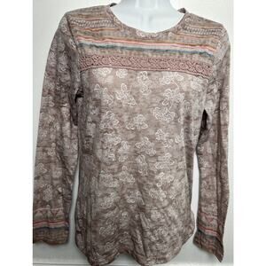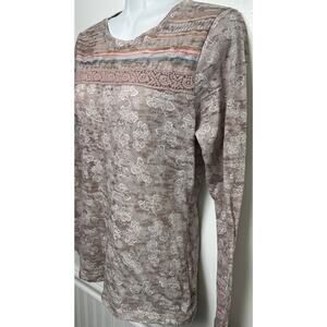 This is a PrAna women's long sleeve burnout top in size small. The top features a floral print in pink and purple, with a round neckline and a pullover closure. It is made in the USA from a knit fabric blend of polyester and cotton. The top has crochet accents, a logo tag at the hemline, and offers a lightweight and breathable feel. It is suitable for casual wear and travel, with a basic style that reflects an outdoor life theme.