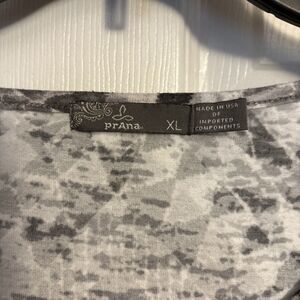 In excellent condition. The PrAna Women's Long Sleeve Shirt in size XL features a stylish gray and white print design, making it a versatile and trendy addition to any woman's wardrobe. Made by the brand prAna, this pullover top is designed for regular size women looking for a comfortable and fashionable top.