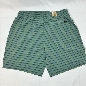 Prana Men’s draw string green striped swim shorts with mesh pockets and back zippered pocket.