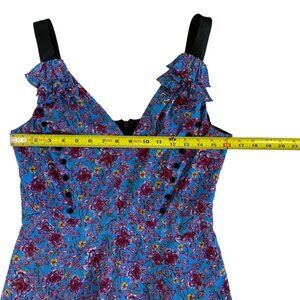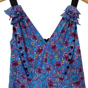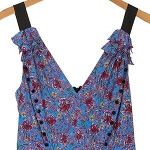 Prabal Gurung Collective sleeveless maxi dress in a blue floral printed chiffon. Beautiful dress with a V-neckline and decorative buttons on the bodice. Two flowing black ribbons hang down the back from the shoulders. Please see pictures for more details and measurements.