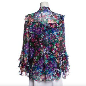 No tag but never worn! Gorgeous 100% silk top with a tie neck and exaggerated ruffle sleeves. The body is lined in black silk and the sleeves are unlined/slightly sheer. The fabric is very drapey and could fit S-M.