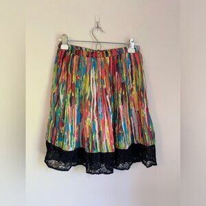 This vibrant mini skirt features a multicolor striped design with a flowy silhouette and elegant black lace hem, offering a stylish and polished look.