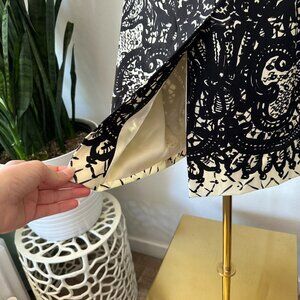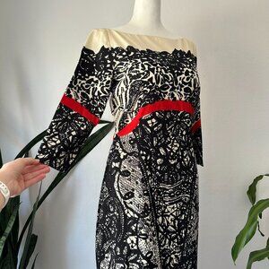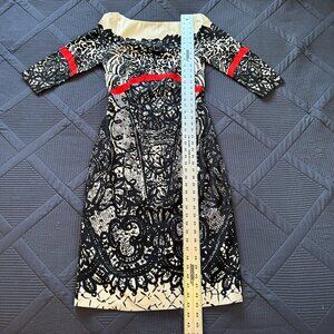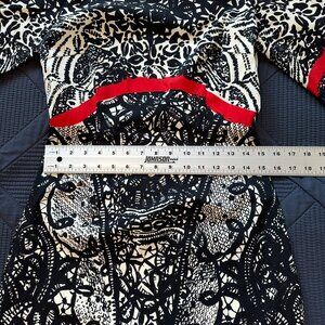 Black lace print on cream background with red detail at sleeves and waist