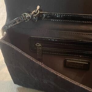 Detachable faux patent leather strap. Wear on shoulder or detach and use as a clutch