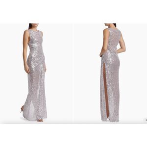 Finished in shimmering sequins, Prabal Gurung's glamourous sleeveless gown flaunts a draped round neck and side slit.
