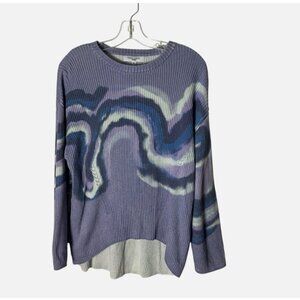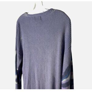 Prabal Gurung x RTR - Women's tie-dye ribbed sweater, long sleeve, relaxed fit, chunky ribbed-knit construction, midweight, with hi-low curved hemline, slightly wide sleeves, and crew neckline, purple with blue/white tie-dye accent on front and sleeves. Original retail $310.