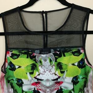 Top of garment is sheer black mesh, balance is a pretty spring/summer abstract floral print in yellow, green, black, red, purple & white