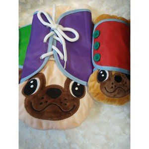 Practice Dressing Stuffed Animals, New. Includes 4 dogs with buttons, zipper, snaps, and string for teaching children dressing skills and to aide with fine motor development. Nylon "jackets" are easy to wipe off and clean. Smoke free, pet free home.