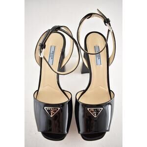 Prada 115mm Black Patent Leather Platform Sandal Ankle Strap Block Heel Pump 40