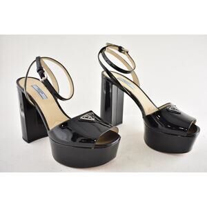 Prada 115mm Black Patent Leather Platform Sandal Ankle Strap Block Heel Pump 39