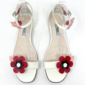 Prada floral sandals, Prada flower appliqué sandals, Prada 2017 sandals, ivory leather sandals, designer summer flats, Prada size 39, Prada resort shoes, floral ankle strap sandals, Prada vacation sandals, flat designer sandals, Italian designer sandals, luxury summer shoes, floral detail flats, garden party sandals, Prada runway sandals, feminine leather sandals, white patent leather sandals, retro style, vintage style.