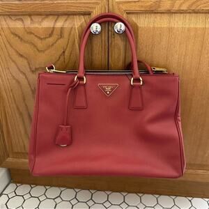 As close to like new as you are ever going to get! This is an authentic PRADA Saffiano Lux Small Galleria Double Zip Tote in Fuoco. This chic tote is crafted of lustrous Saffiano cross-grain leather in red. The handbag features rolled leather top handles. The top opens to a red Prada jacquard fabric interior with zipper and patch pockets, and zipped compartments on either side. Comes with off brand dust bag!