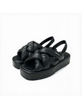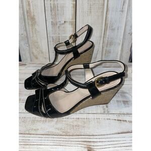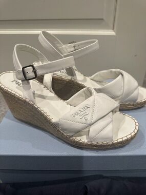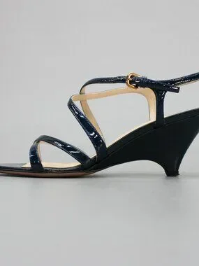 An Italian pair of women's Prada open-toe sling-back blue patent leather kitten 2.75" heels wedge dress shoes