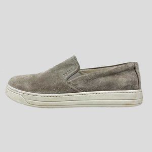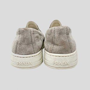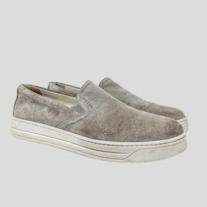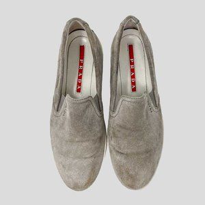 Prada Linea Rossa suede slip-on sneakers. Round toe. Elastic webbing in notched vamp. Slip-on style. Leather lining. Rubber sole.